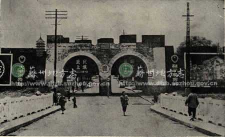平门 位于城北,当年伍子胥平齐大军从此门出,打败齐国,班师回朝,又由此门入,故名。古平门久塞,1928年为便利交通重辟平门,1958年拆除。图为1947年的平门。