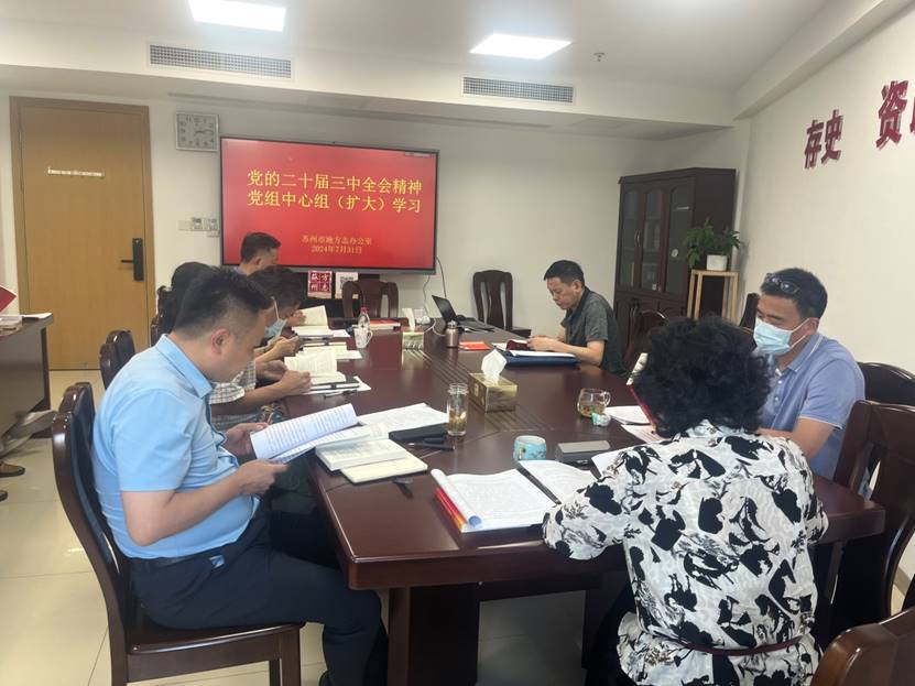 7月31日,市地方志办召开党组理论学习中心组(扩大)会议,传达学习党的二十届三中全会精神,研究部署学习贯彻举措。市地方志办公室党组书记、主任乐江主持学习会。