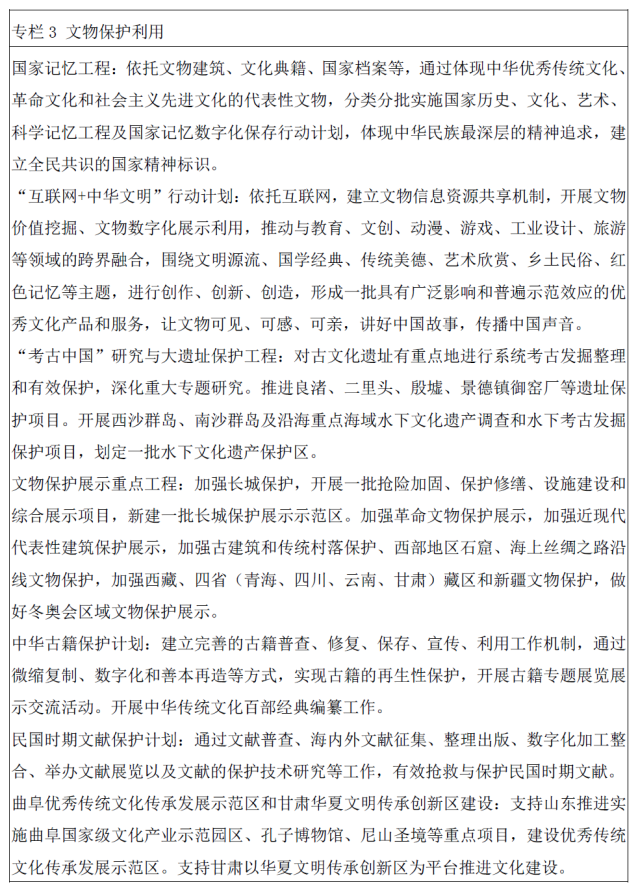 (一)加强文物保护。推动文物保护由抢救性保护为主向抢救性与预防性保护并重转变,由注重文物本体保护向文物本体与周边环境、文化生态的整体保护转变。健全国家文物登录制度,建立国家文物资源总目录和大数据库,推进文物信息资源社会共享。加强不可移动文物保护,对存在重大险情的各级文物保护单位及时开展抢救性保护,加强文物日常养护、岁修、巡查和监测。加强革命文物保护,实施革命旧址保护修缮三年行动计划和馆藏革命文物修复计划。加强城乡建设中的文物保护,保护历史文化名城、街区、村镇和传统村落的整体格局和历史风貌。加强大遗址保护和国家考古遗址公园建设,开展大遗址数字化展示监测试点。加强考古发掘和整理研究工作。开展水下文物考古调查,基本掌握水下文物的分布和保存状况。加强世界文化遗产保护管理工作,推进海上丝绸之路保护与申遗工作。加强可移动文物保护,实施馆藏珍贵文物修复工程。严格文物执法,强化文物督察。实施文物平安工程,提升文物安全监管能力。