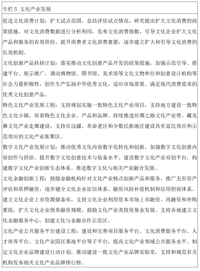 ——“十三五”期间,以文化产业成为国民经济支柱性产业为目标,支持实施一批具有示范带动效应的重点文化产业项目,培育一批集聚功能和辐射作用明显的国家级文化产业园区,打造3至5个市场化、专业化、国际化的重点文化产业展会。