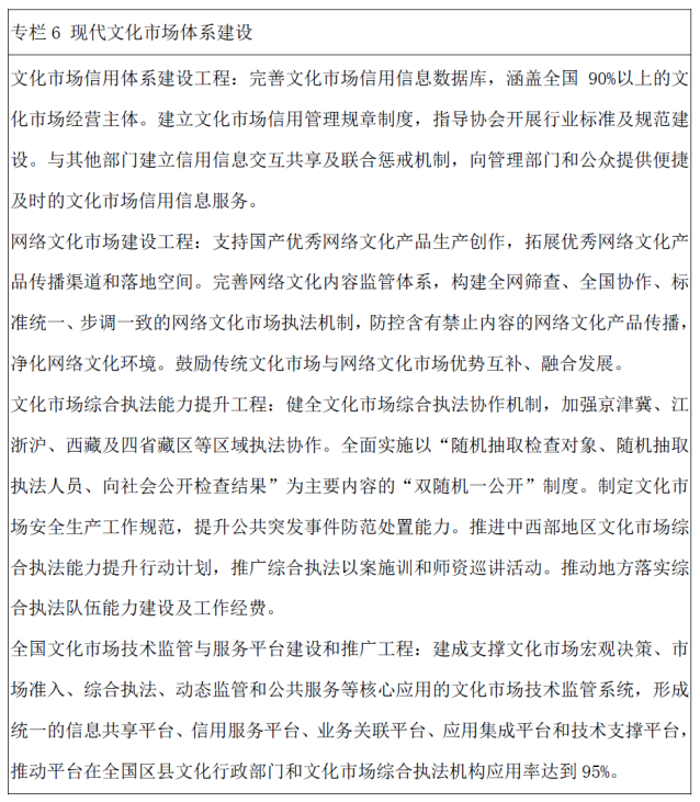 ——到“十三五”期末,基于文化市场技术监管与服务平台的文化市场信用信息数据库涵盖全国90%以上的文化市场经营主体,文化市场技术监管与服务平台在全国区县级文化行政部门和文化市场综合执法机构应用率达到95%以上。