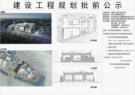 公示信息显示,国家方志馆江南分馆位于苏州吴文化博物馆东侧,地上四层地下一层,总建筑面积14256.23平方米。