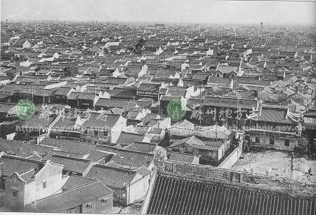 043北寺塔上俯瞰苏州古城 城内建筑粉墙黛瓦,鳞次栉比。三清殿、钟楼、双塔和因果巷消防警钟楼依稀可见,构成了苏州古城优美的空间风景轮廓线。摄于30年代。