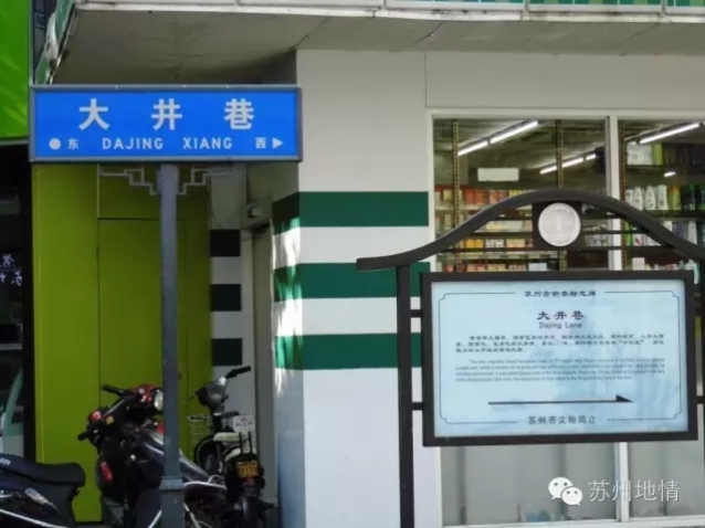 大井巷:西起人民路,东至邵磨针巷,巷长171米,宽6.4米,沥青路面。本名大酒巷。唐代富翁在巷内治亭馆、酿美酒,以宴宾旅,酒价颇高,故名。大酒巷后为大井巷。《姑苏图》、《苏州城厢图》、《吴县图》、《苏州图》均标大井巷。民国时期形成旅馆一条街。