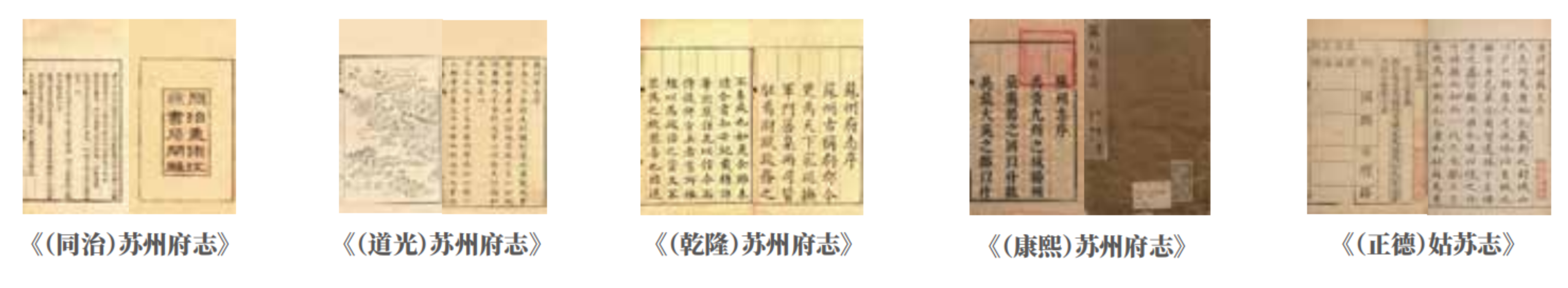 现存府一级的旧志,有署名唐陆广微所撰《吴地记》、北宋朱长文所撰《吴郡图经续记》、南宋范成大所撰《吴郡志》、明卢熊所撰洪武《苏州府志》、明王鏊所撰正德《姑苏志》,以及清代康熙、乾隆、道光、同治时期四部《苏州府志》。