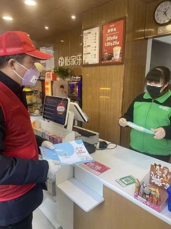 苏州市方志办党组书记、主任陈兴南在向社区商家分发防护宣传材料