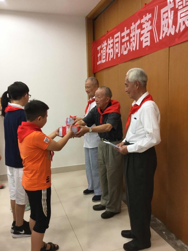 2017年8月23日上午,作者王道伟(右二)向平直小学等学生代表赠送《威震太湖》一书