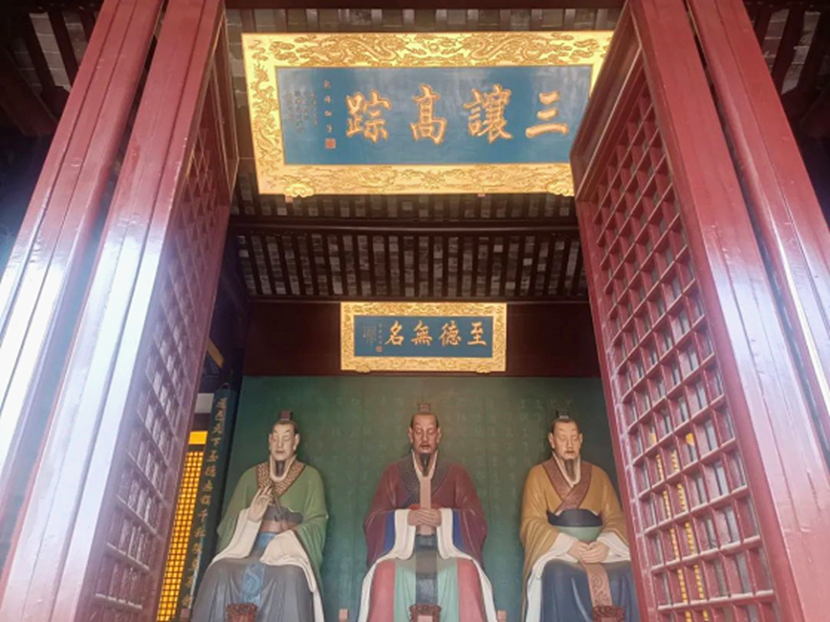 ▲苏州泰伯庙至德殿,从左至右依次为季札(仲雍第十九世孙)、泰伯、仲雍。“至德无名”为康熙御题,“三让高踪”为乾隆御题。