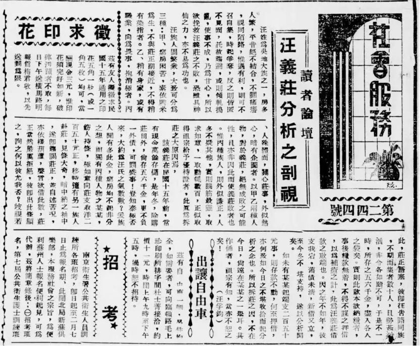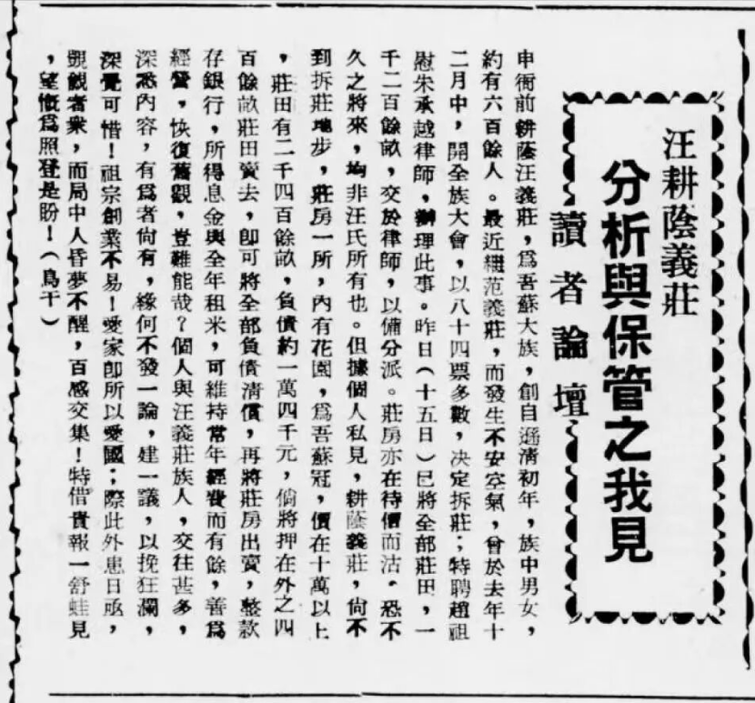 义庄已难以为继,遂寻求卖主。得知义庄不保,在外地的汪氏族人共64人,联合在1939年9月23日《苏州新报》刊登声明,反对出售。