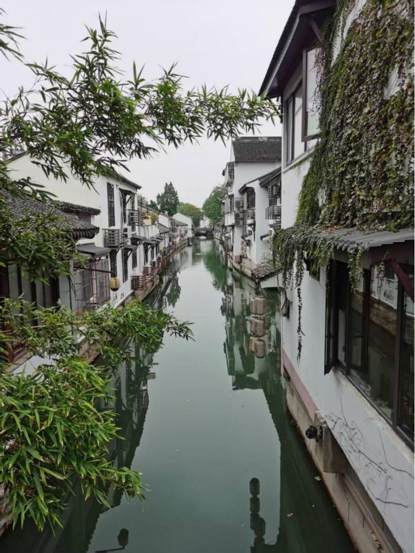 举起镜头,处处皆可入画。而这画又不独静美——藤编灯笼成串垂挂窗边,随风轻摇;流水泛着柔光,涟漪细细,不知是空调滴水洇开的纹路,还是鱼儿唼喋,或是看客心波微漾。墙头的一片爬山虎,屋角的几竿翠竹,亭边的一树绿叶,桥栏上的几朵小花,它们都在你未定格的镜头里摇摇摆摆,身姿曼妙。小巧灵活的鸟雀,叽喳两声,擦着屋檐,轻俏掠过你的眼眸。前方小石桥上,行人车辆在匆匆穿行,年轻的情侣偎在桥栏边比心拍照。有人向着你的方向举着手机,把你和这一片小桥流水粉墙黛瓦一起保存,成为他镜头里姑苏好风光的美丽注解。